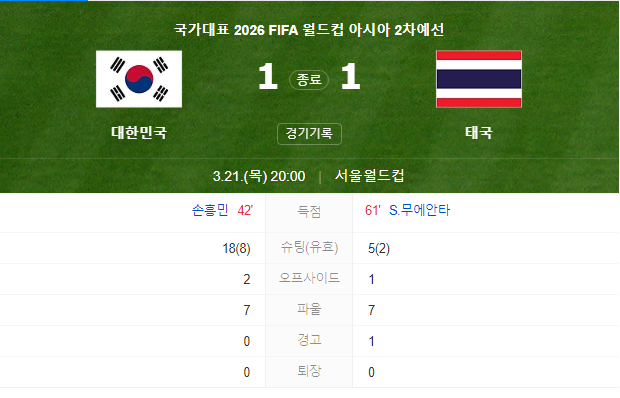 한국은 지난해 11월 싱가포르(5-0 승), 중국(3-0 승)을 연이어 이겨 3연승을 달성했으나, 이번 경기로 3연승을 이루지 못했습니다. 그러나 2승 1무(7점)로 그룹 선두를 유지했습니다. 태국은 1승 1무 1패(4점)의 기록을 갖고 있습니다.