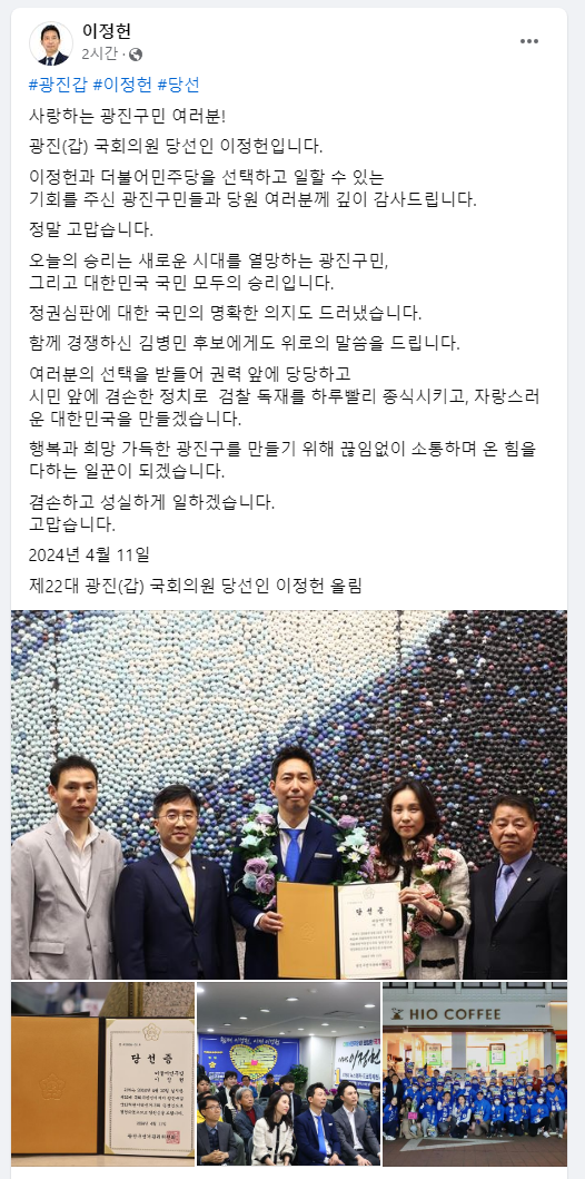 22대 국회의원선거에서 서울 광진갑 지역구 이정헌 더불어민주당 후보가 당선되었습니다. 이정헌 당선인의 프로필에 대해서 자세히 알아보겠습니다.