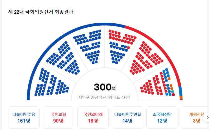 | 이 글의 요약 · 더불어민주당의 과반석 넘은 압승 161석 · 국민의힘 비대위원장 한동훈, 한덕수 국무총리 사퇴 |
